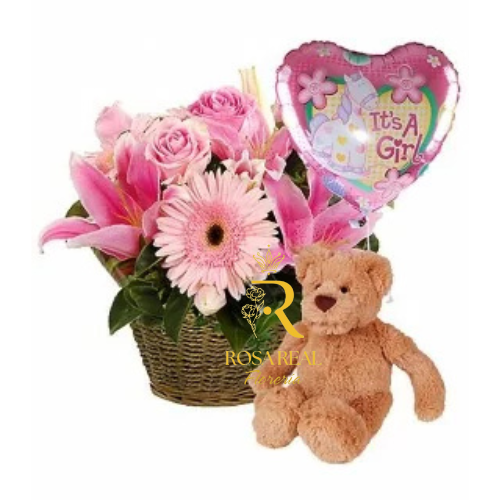 Celebra la llegada de un nuevo integrante a la familia con esta encantadora canasta de flores para nacimiento, que incluye gerberas y rosas naturales, un tierno peluche suave y un globo decorativo con mensaje de bienvenida.